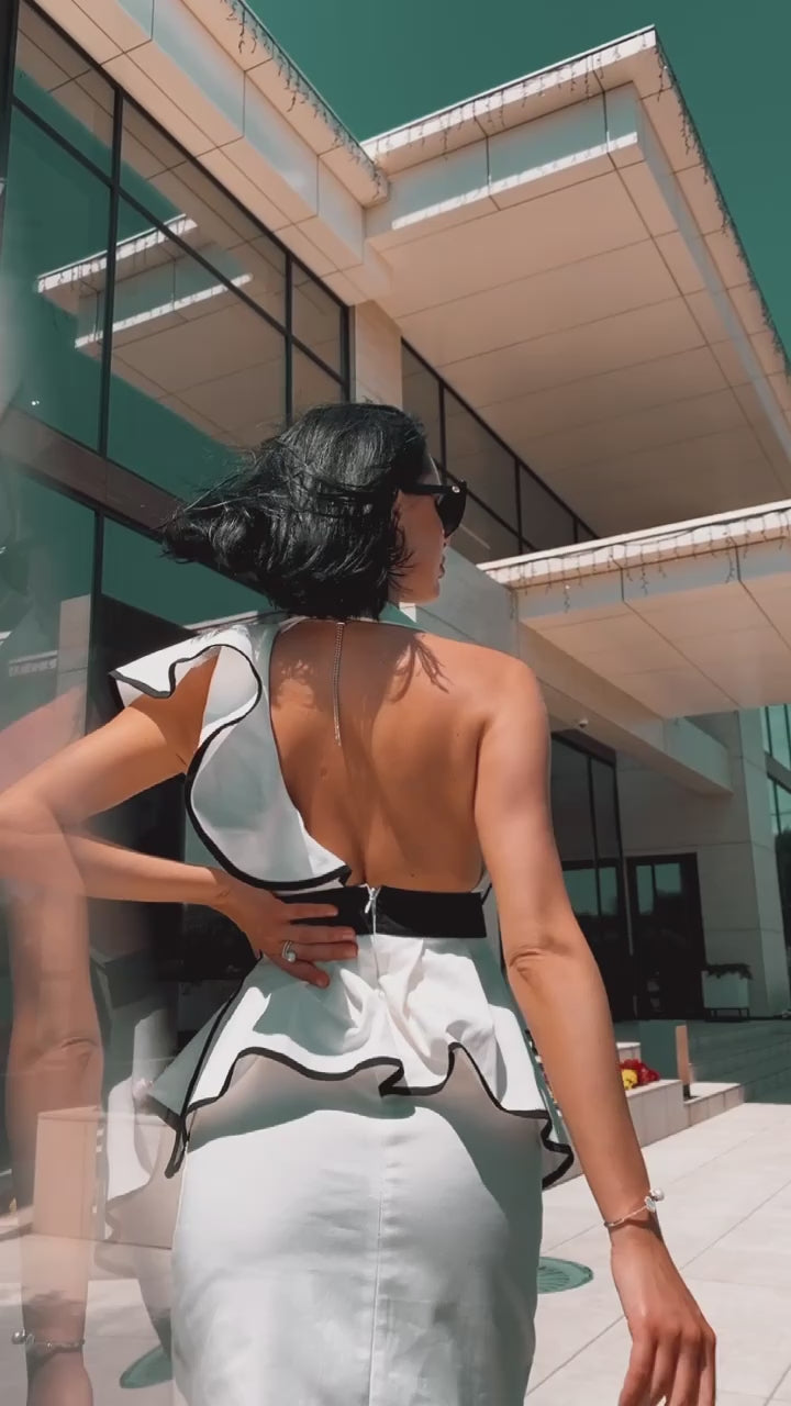 A perfect colour combination of white and black. Stylish asymmetry in the upper part. Alluring cut in front. Another beautiful accent is the open back.