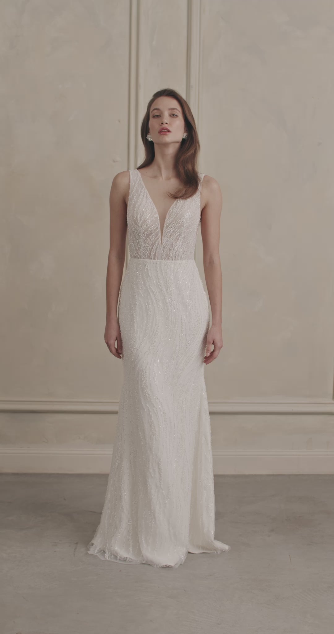 Step into timeless elegance with this stunning beaded wedding gown. Crafted with meticulous attention to detail, this gown features a plunging V-neckline that adds a touch of allure, balanced by the sophistication of its intricate beadwork. The fitted bodice is adorned with shimmering beads that cascade down the length of the gown, creating a mesmerizing pattern that catches the light with every movement. The dress boasts a low-back design, providing a graceful silhouette from every angle. Its fitted skirt flows into a delicate train, ensuring a grand entrance and an unforgettable walk down the aisle. Made from high-quality fabrics, this gown combines comfort with couture, making it perfect for the modern bride seeking a blend of classic beauty and contemporary style. Whether you envision a romantic garden wedding or a glamorous ballroom celebration, this beaded wedding gown promises to make you the center of attention on your special day. Embrace this gown's elegance and charm and create memories that will last a lifetime.